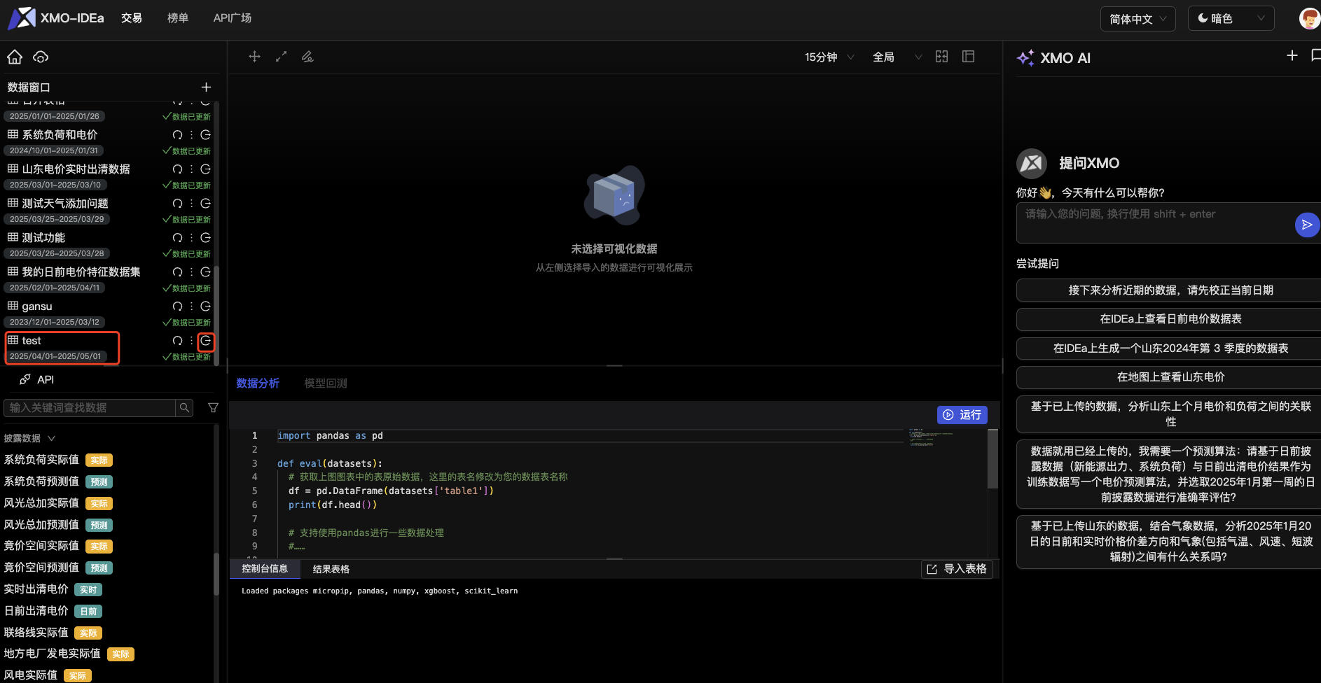 有时候想跑一个复杂策略,比如结合气象数据、负荷预测、电价曲线,做一个储能收益模拟,这时候可以打开 IDEa 的在线研发环境(服务由 XMO-Studio提供),借助XM-Coder 一起写代码。